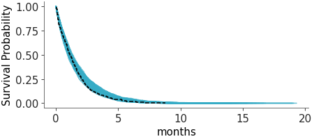 Instead of plotting the raw data observation and predictions, as is common in posterior predictive checks, this function computes the Kaplan-Meier survival curves for observed and for predictive data computes survival probabilities limited to a factor of the maximum observed data to avoid extending the survival curves too far beyond the range of observed data.
