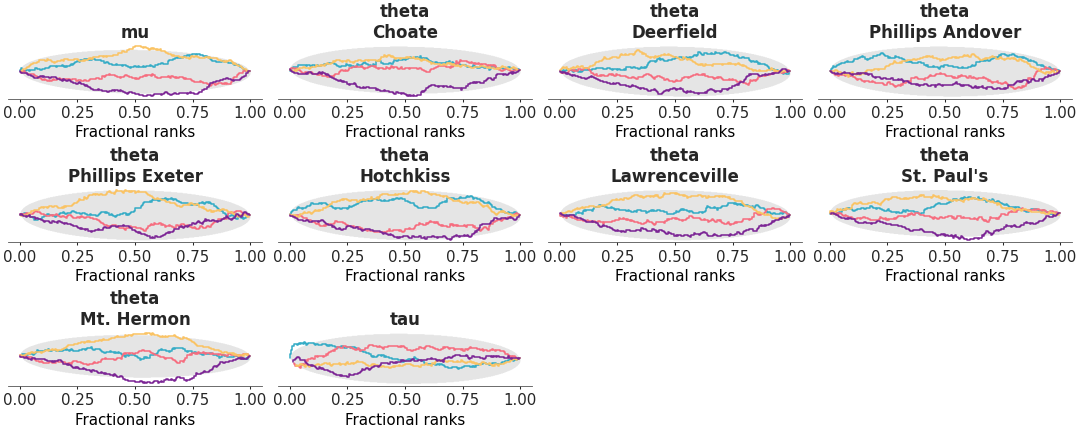 Rank plots are built by replacing the posterior draws by their ranking computed over all chains. Then each chain is plotted independently. If all of the chains are targeting the same posterior, we expect the ranks in each chain to be uniformly distributed. To simplify comparison we compute the ordered fractional ranks, which are distributed uniformly in [0, 1]. Additionally, we plot the Δ-ECDF, that is, the difference between the expected CDF from the observed ECDF. Simultaneous confidence bands are computed using the simulation method described in [1].